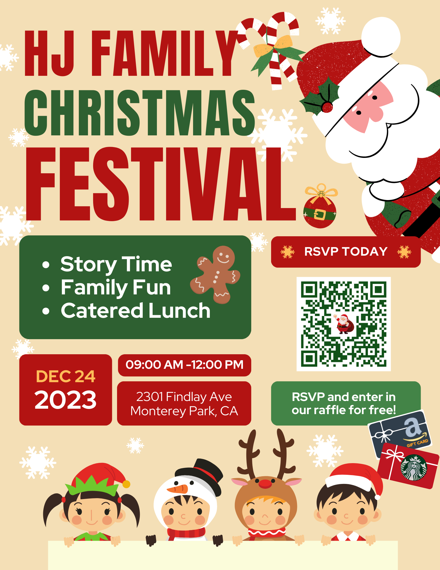 We will have “HJ Family Christmas Festival” at our church on Sunday, December 24 at 9:00 am. Mark your calendar! Come with your family, invite your friends and neighbors! Hyojeong Nuri Christmas Service, fun activities for kids, luncheon for everyone! There is no fee. Love offerings are greatly appreciated. We set up a simple registration link to prepare enough lunch for everyone. Scan the QR code on the flyer, or click: https://forms.gle/UKk2u2RAQq9WxNMx5. RSVP and receive a free raffle ticket.
